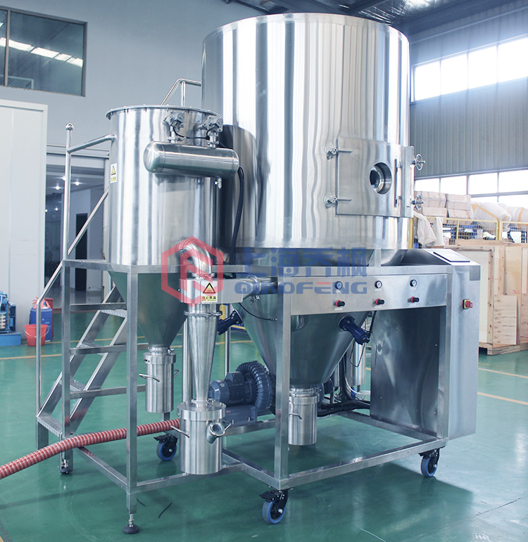 操作原理是空氣通過過濾器和加熱器,進入干燥塔頂部的空氣分配器,然后均勻地進入干燥室的螺旋形狀。 液體通過過濾器從液體罐泵送到干燥塔頂部的離心霧化器,使液體噴入極小的霧滴,液體液體與熱空氣平行接觸, 水迅速蒸發。 在短時間內干燥成品。 成品從干燥塔底部和旋風分離器排出,廢氣通過風扇排出。